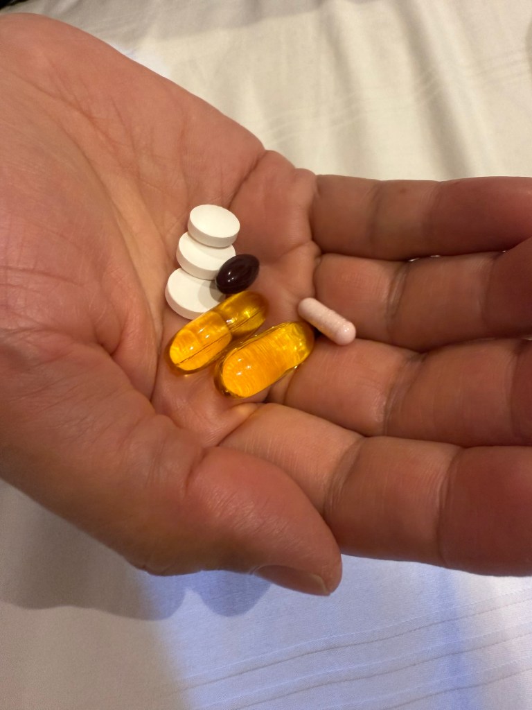 To date, two years after that initial K2 softgel, Hubby’s nightly supplements have stabilised to this stash.